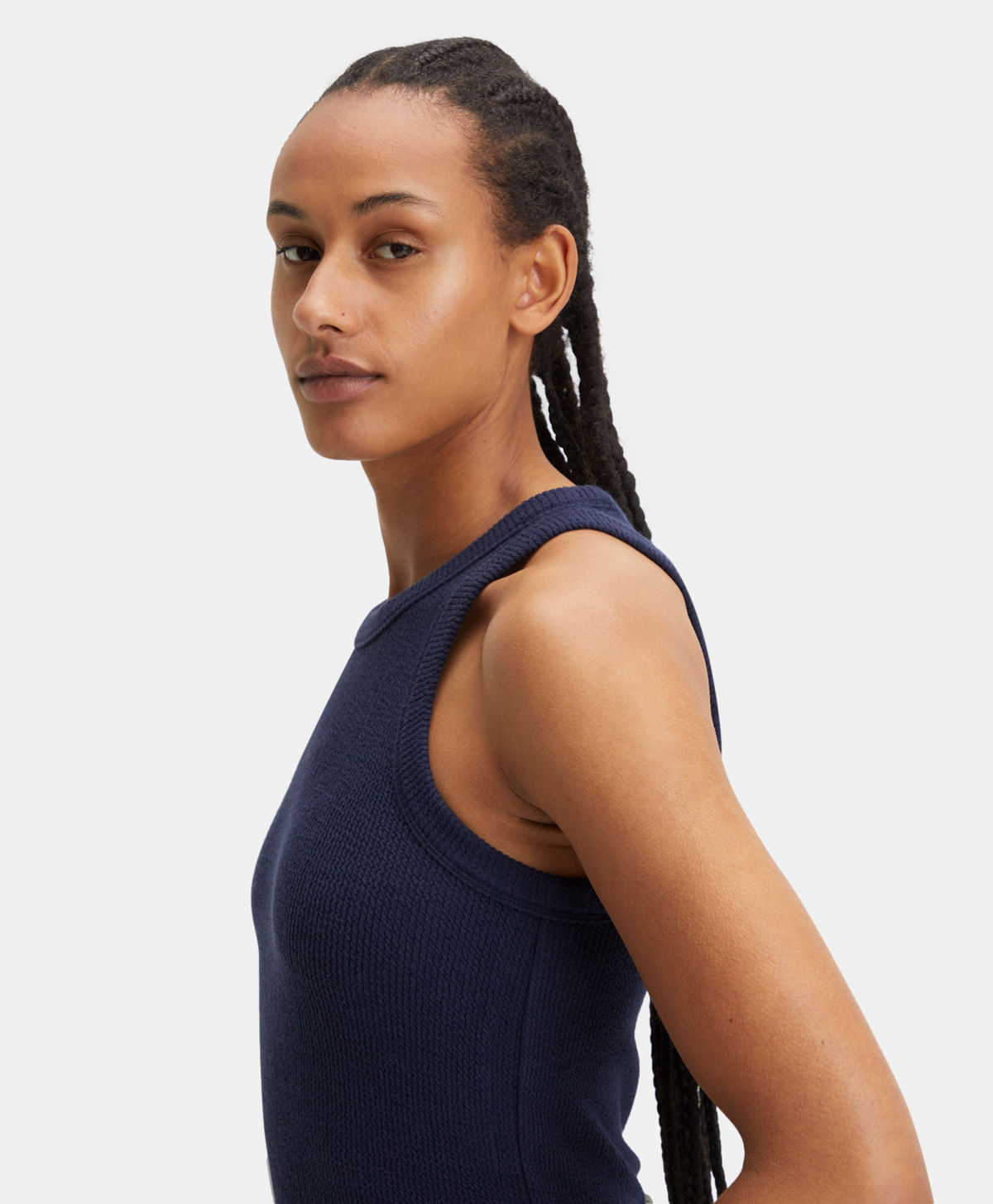 Una playera sin mangas de punto acanalado suave hecho con una mezcla de 97% algodón orgánico. Te encantará cómo se siente su textura acanalada afelpada y su tejido ondulado. Así la uses sola o como una pieza de capas, te encantará. Un top texturizado con una textura maravillosa.